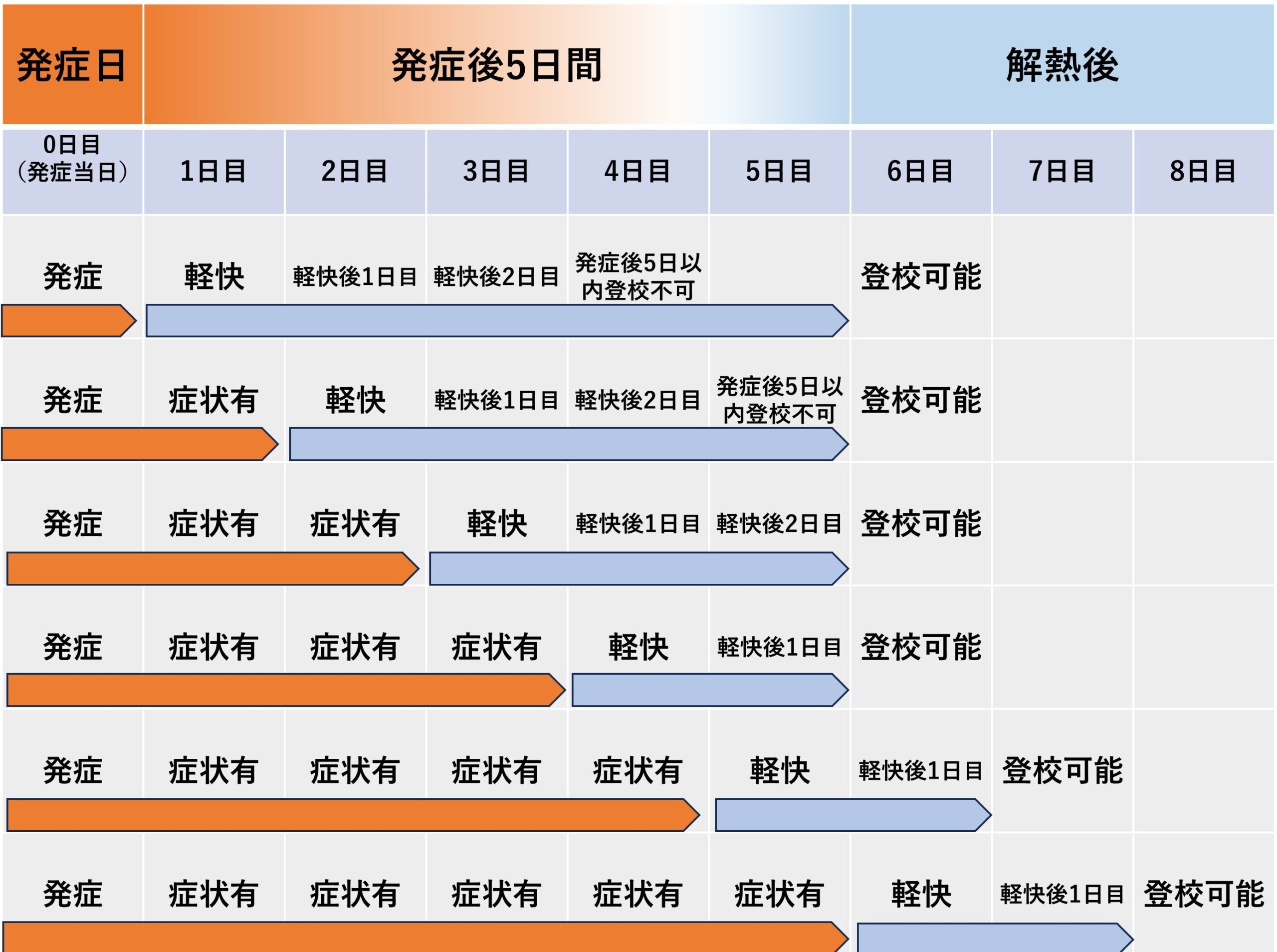 - 発症日(発熱や呼吸器症状有り)を0日とします。